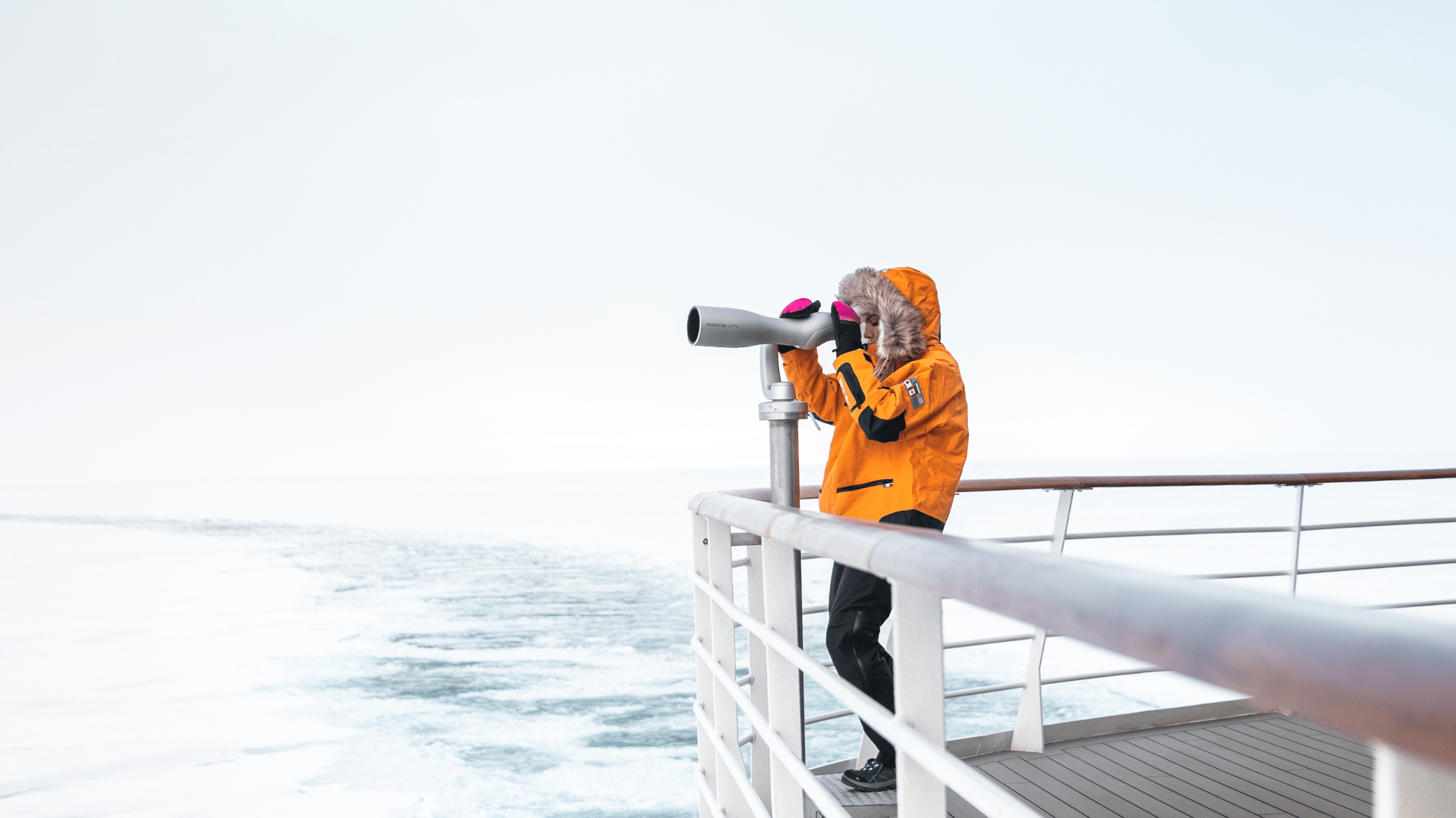 於豐饒海域觀察座頭鯨、藍鯨或海豚的身影。午後微風中,旅人倚靠欄杆遠眺冰層浮動,任思緒在海天之間流淌。
