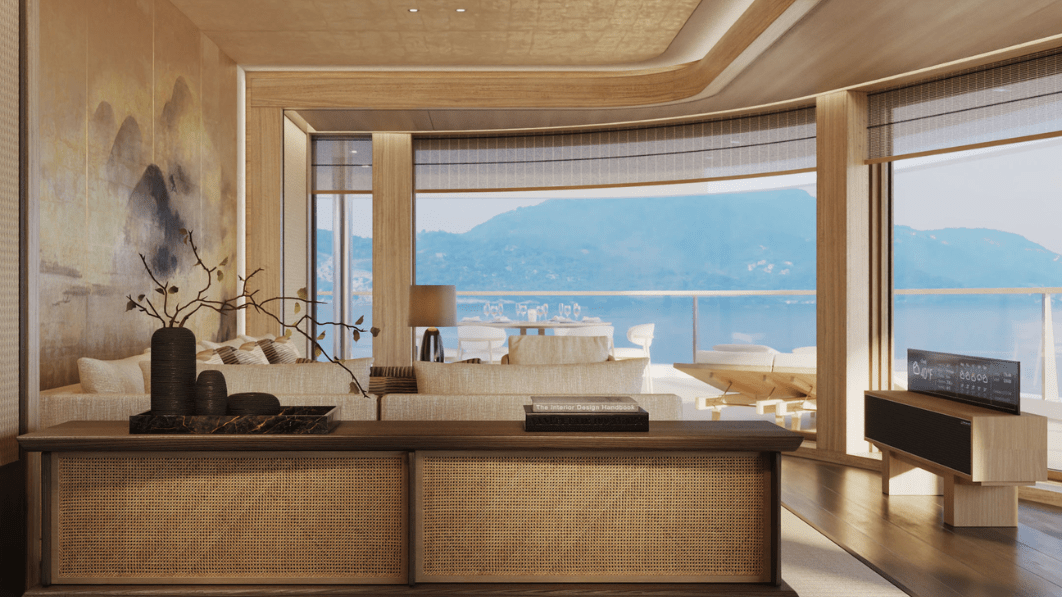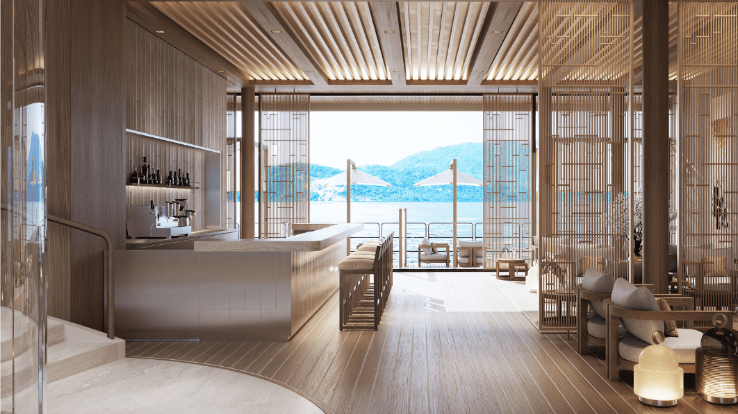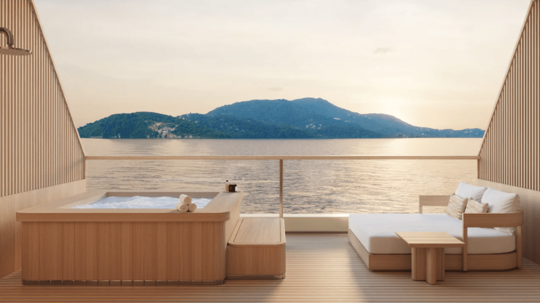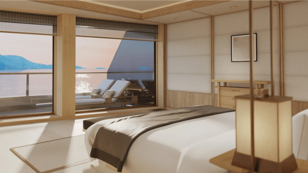 全船僅設 47 間套房,每一間皆以 Aman 一貫的極簡語彙打造:溫潤木質、柔和石材與自然光影,構築出如居家般的靜謐尺度。落地海景窗將海平線引入室內,私人陽台則讓時間有了被延伸的空間;部分套房配備獨立浸池,讓旅人於海天交界間獨享片刻沉靜。這樣的低密度設計延續 Aman 的哲學「奢華不在於擁有更多,而在於保有距離、餘白與呼吸。」