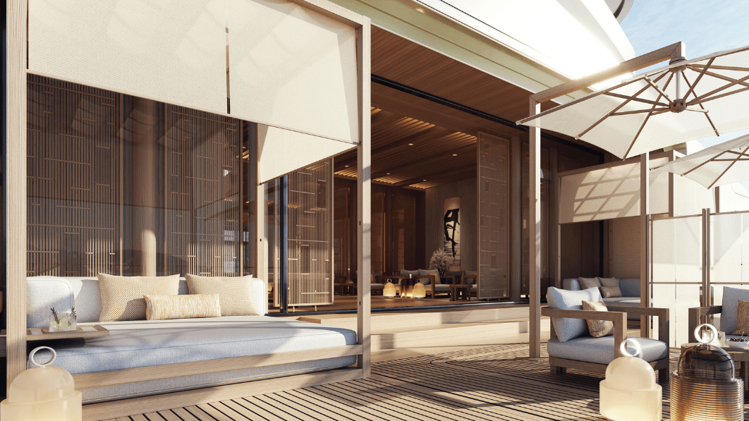 位於遊艇最頂層的 Aman Spa,是 Aman 標誌性療癒哲學在海上的延伸。靈感取自品牌聞名的日式養生傳統,以「靜、淨、和」為設計核心,運用天然木材與石材打造沉穩氛圍。賓客可在開放式療程間隨海風與光影流動,體驗結合按摩、香氛與能量平衡的全方位療癒。環繞其外的空中花園與無邊海景,讓每一次深呼吸都成為冥想的節奏——這是海上最接近靜心的所在。