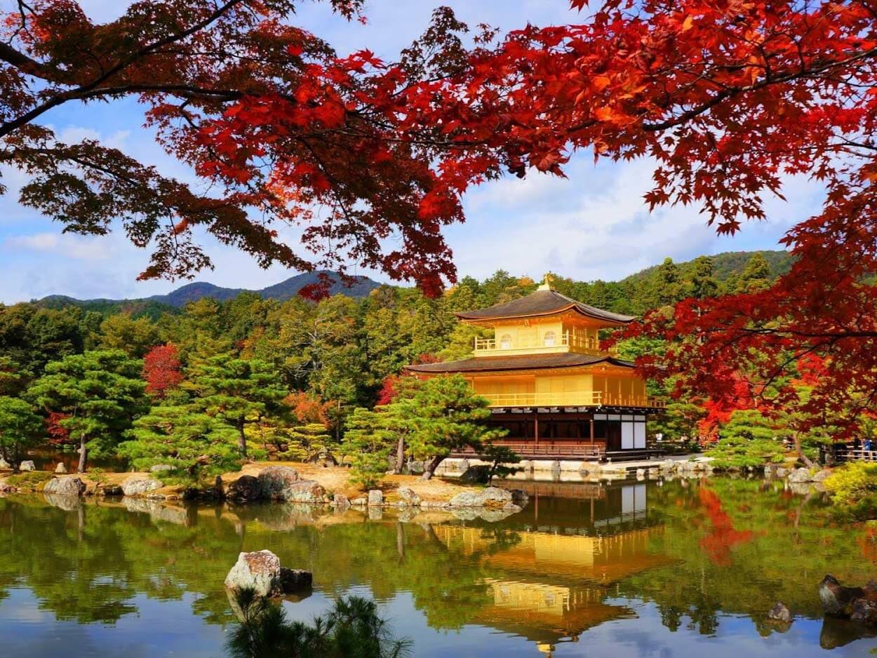 被金箔包裹的 #金閣寺 (鹿苑寺)亦是#世界遺産 之一,在楓葉季節,這片點綴著金閣的庭園湖泊,映襯著楓葉的倒影,如同水墨畫般令人陶醉,金閣寺周邊的庭園也種滿了楓樹,這裡不僅可以欣賞楓葉,還能感受到日本傳統園林的雅致和靜謐。