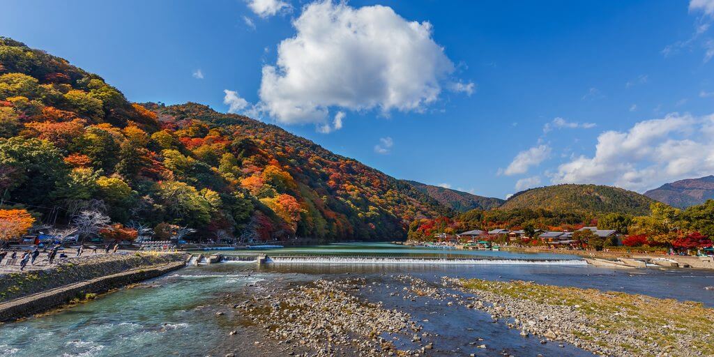 在京都,有著眾多可觀賞楓葉的景點,其中最著名的當屬 #嵐山 。嵐山是京都的自然寶庫,擁有著茂密的竹林和壯觀的山水景色,而在楓葉季節,這裡更是變得如詩如畫。遊船穿梭在岐阜川上,河岸兩側的楓樹隨著江水搖曳生姿,讓人彷彿置身於仙境中。除了 #保津川遊船 ,登上嵐山的山頂或是蓮花峰,更能一覽整片山谷的楓葉美景,遠處的京都市區在楓紅的映襯下格外迷人。