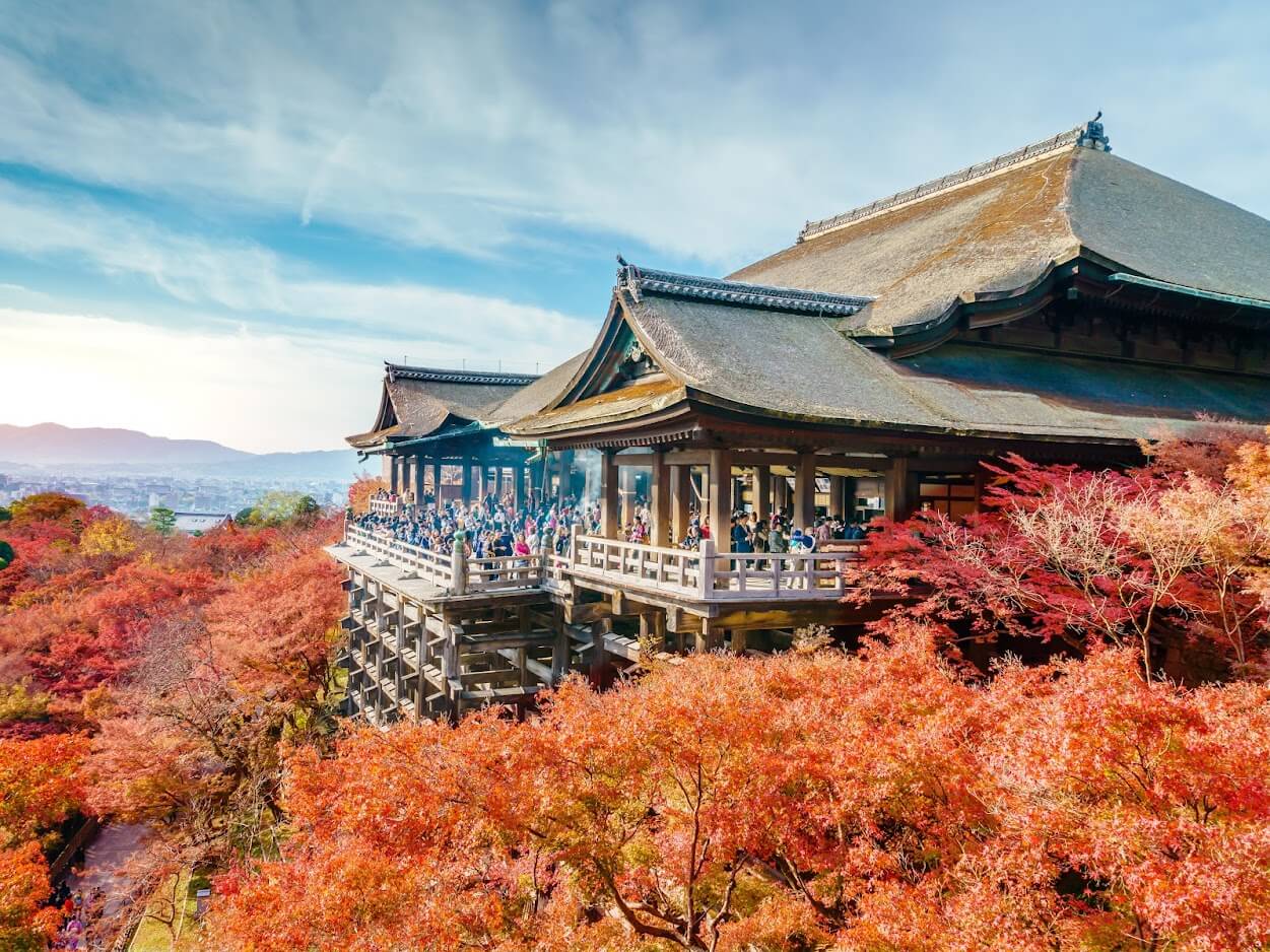 知名的#清水寺 也不能錯過,建築融合了優雅的日本寺院風格,與蔚藍的天空和綠意盎然的庭園相得益彰。楓葉季節,清水寺的石階道路兩旁種滿了楓樹,每當微風吹過,落葉紛飛,彷彿在為參拜者散落祝福般的美好。夜晚,清水寺周邊的燈籠和燈飾點亮,將寺廟映襯得更加神秘動人。