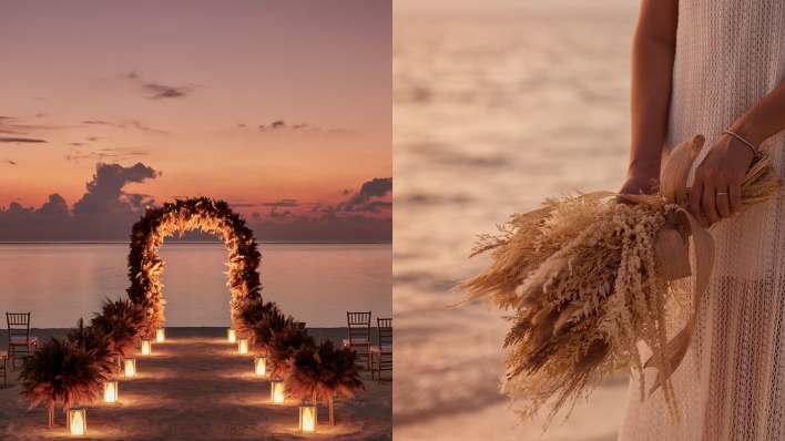 想像一場遠離塵囂的海島儀式,就在這片如粉末般潔白的私人沙灘上舉行。沒有多餘的觀禮喧嘩,背景只有潟湖拍打岸邊的規律律動與棕櫚樹的沙沙聲。在這趟旅程中,你們赤腳踩在溫暖的白沙上,對著深邃的綠松石色大海許下諾言。當夕陽將海面染成溫柔的玫瑰金與薰衣草紫,這道光影成了最天然的見證。儀式後,於延伸至海心的露台上享受一場私密的燭光晚宴,在星空與濤聲中細細反芻承諾的重量。這不僅是一場婚禮,更是一次與自然共鳴的靈魂洗禮,讓你們的專注力完全回歸到彼此身上,感受那份最純粹、無人打擾的悸動。